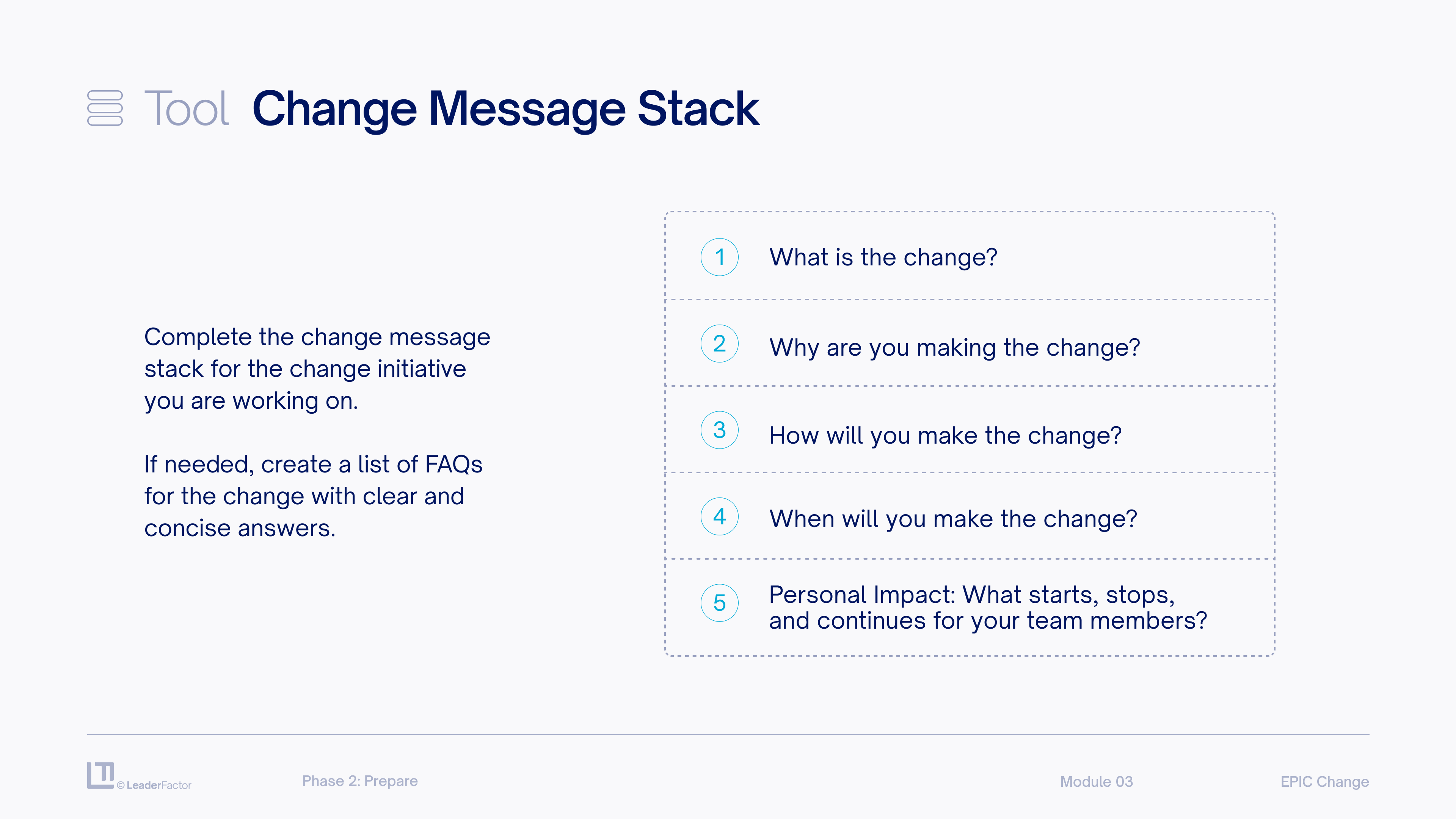 - Apply the EPIC™ Change framework to plan change in a way that increases participation and reduces resistance.